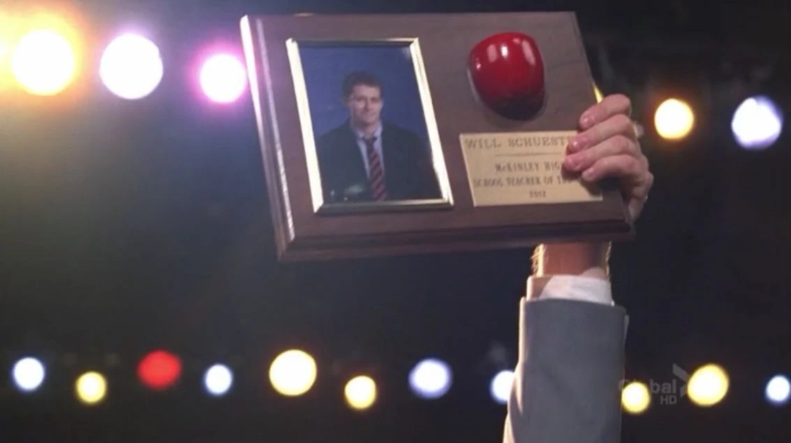 Auf der Feier verabschiedet Figgins zuerst Mrs. Hagberg in ihren Ruhestand und ruft danach "Finchel" auf die Bühne. Die beiden verkünden, dass der Gewinner des Lehrer des Jahres-Preises Mr. Schuester ist und halten eine kleine Rede darüber, wie er ihre Leben verändert hat. Will ist gerührt und