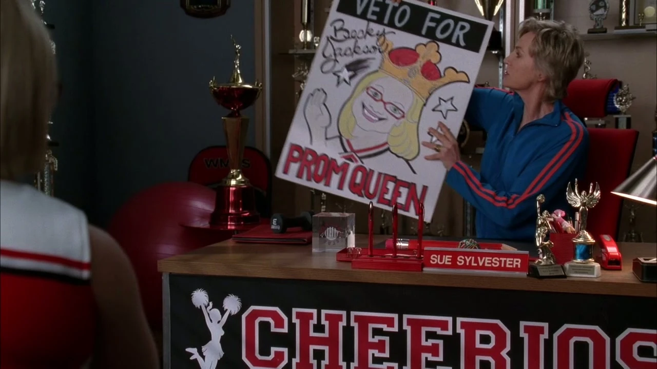 niginnen nicht immer gleich aussehen müssen, manchmal auch anders, zum Beispiel kleiner und tragen Brillen, damit sich selbst meinend und sieht sich die Postser der Nominierten an. Von diesen will sie wissen, warum sie denn so grinsen und sagt ihnen, dass sie aufhören sollen sie anyustarren, da es nicht witzig ist. Da sie immer frustrierter ist, lässt sie ihre Wut dann an sämtlichen Xylophonen der Schule aus und terrorisiert die Warteschlange an der Essensausgabe, weshalb Sue sie zu sich ruft und darauf anspricht. Becky sagt ihr, dass sie Ballkönigin sein will, so wie sie es in der Werbung gesehen hat und bekommt erklärt dass das nicht Wirklichkeit ist. Außerdem würde ihre Werbeposter eine verdrehte Botschaft vermitteln, da sie sich verschrieben hat, womit Becky sich rechtfertigt, da