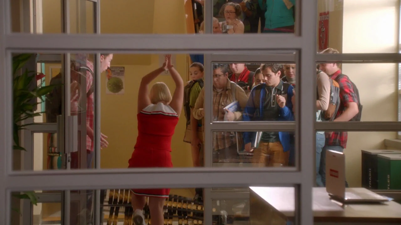 McKinley, dass sie eine von "Mutter Monsters ergebenen Schülern" ist und befiehlt ihnen unverzüglich ihre Laptops zu öffnen. Als das gemacht wird, sieht man einen Teaser von Sam, der sie in die Aula zu ihrer Performance einlädt, wobei auch Becky anwesend ist. Sie ruft, dass sie unterhalten werden will, wird aber von Will gestoppt, der ihr sagt, dass sie sich setzen soll. Daraufhin sieht sich die Performane von Applause an, bei der sie am Ende applaudiert und kommentiert Marleys Suspendierung mit "oh verdammt".