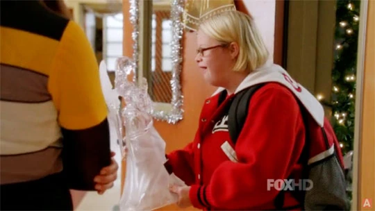 von "grün" zu schätzen weiß, es aber so aussieht, als hätte sie das ganze Zeug aus der Mülltonne gefischt. Becky äußert, dass die Sachen recycelt sind, doch as Sue einwirft, dass sie faul sind, stimmt sie ihr zu und gesteht, dass es nur halbherzig gemacht ist, weil sie nach Hause gehen wollte um Showtime zu gucken. Wieder in der Realtität lässt sie Tina und Sam wissen, dass sie sich wie sie fühlt, wie Verlierer, wünscht ihnen aber dennoch schöne Ferien und geht geknickt davon. Die zwei verkünden später den New Directions, dass die den Preis, einen Glasengel, Becky geben werden, um sie aufzuheitern, wobei Artie darauf hinweist, dass es irgendwie herablassend rüber kommen kann, doch sie beseitigen seine Zweifel, da sie noch etwas anderes für sie geplant haben. Becky unterdessen sieht sich den Weihnachtsbaum der New Directions im Chorraum an, als Sam und Tina zu ihr kom