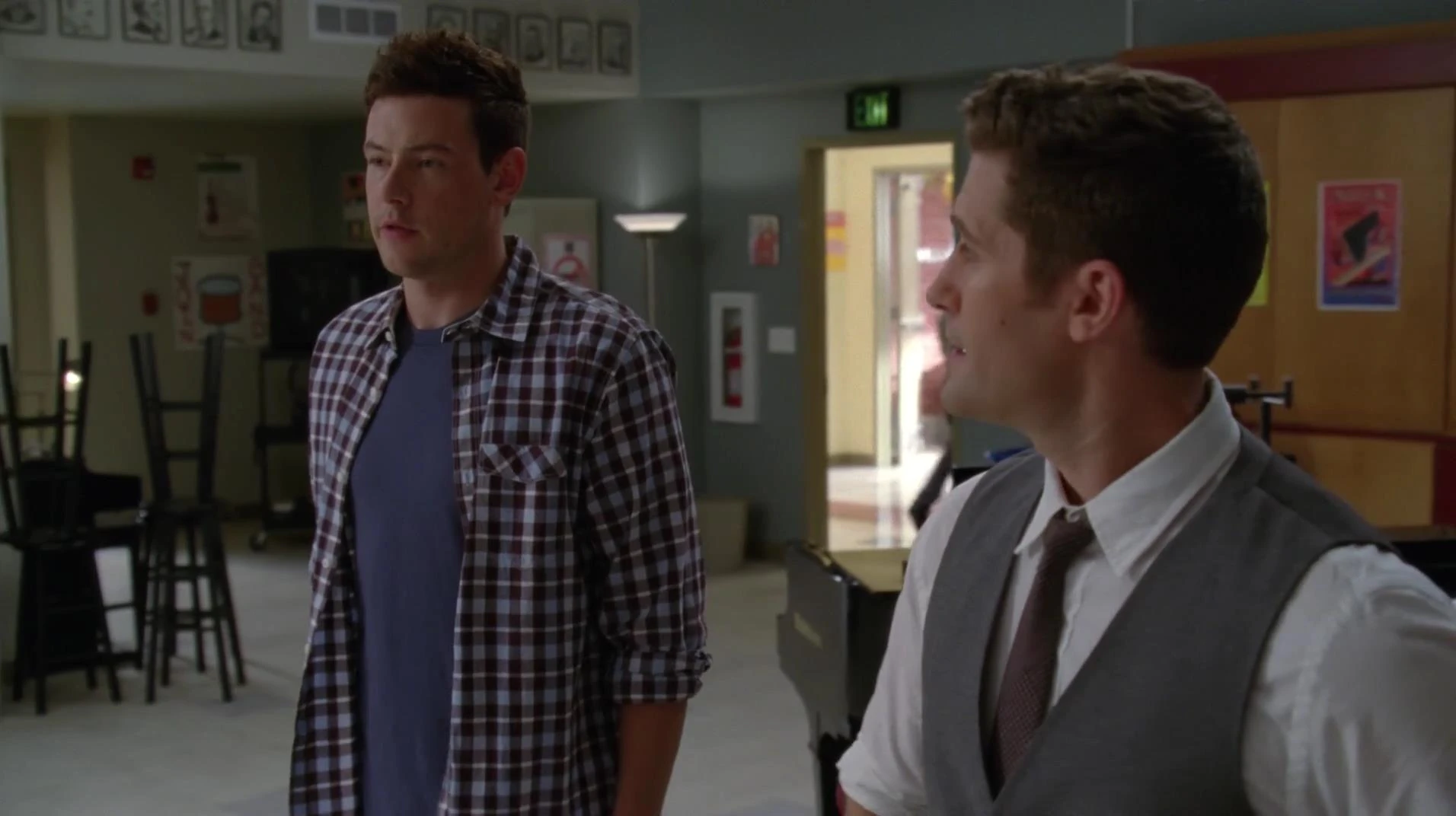 Finn betritt das Lehrerzimmer, was Sue sofort wütend macht. Er möchte sich aber nur bei ihr entschuldigen, doch sie nimmt sie nicht an und erklärt vergnügt, dass sie die Aula für die nächsten zwei Wochen reserviert hat und Finn nun keinen Probenplatz für das Musical hat.