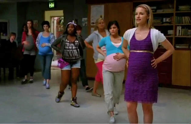 Quinn führt bei der nächsten Glee Probe It's a Man's Man's Man's World vor, mit einer Gruppe von hochschwangeren Backup Tänzerinnen, weil sie unglücklich darüber ist, eine unverheiratete Teenager- Mutter zu sein.