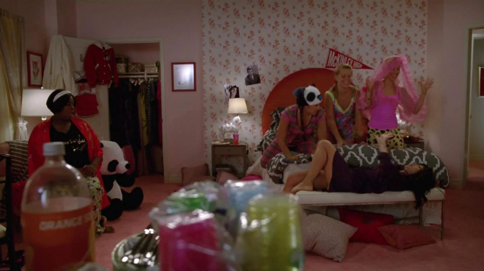 rund der Gene ihrer Mutter, zum Stillstand gekommen ist und jeder den Körper bekommt, den er verdient hat, wobei sie ihr eine Hand auf die Schulter legt. Kitty fährt fort, dass sie auch akzeptieren musste wie sie ist und beinah jedes Wochenende allein verbringt, weil jedermann glaubt, dass das beliebte Mädchen viel zu beschäftigt sei. Sie meint, dass sie deswegen in dem Stück mitspielt, weil sie ein paar echte Freunde brauchen kann und schlägt dann, ganz im "Geiste von Grease" vor, dass es eine gute Idee wäre, sich auf einer netten Pyjamaparty kennenzulernen. Sie lädt die Mädels zu sich nach Hause ein und stimmt zu, dass auch Unique kommen darf, da sonst Marley nicht erscheint. Dort zeigt Kitty ihr zunächst ihre Trophäen bis die anderen mit sämtlichen Knabberzeug und Süßkram auftauchen. Sie bietet Marley gleich einen Donut an, welche fragt, ob sie nicht auch gesunge Snacks hat un