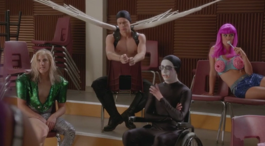 chickt die Warblers erneut weg, doch Will sagt ihnen, dass sie bleiben sollen. Sue verspricht ihm, dass sie alle Warblers ausrupfen wird und erlkärt, dass das jüngste Gericht erschienen ist. Will nennt sie "Susie Q", was Sue unterbindet, während alle anderen zwischen ihnen hin und her sehen. Danach werden ihr und den New Directions swie den Warblers Tanzschritte von Will gezeigt, die der Jungenchor mühelos hinbekommt, während die New Directions kläglich scheitern. Daraufhin geraten die Gruppen an einander, da Skylar der Meinung ist, dass die Choreographie einfach ist und die New Directions nicht mal nah dran waren. Will unterbricht sie, erklärend, dass sie ein Team sind, doch Jane merkt an, dass man da nicht sieht, weil die Hälfte von ihnen Uniformen trägt. Blaine, Kurt und Rachel stoßen dazu und Kurt stimmt Jane zu, dass sie einige Veränderungen vornehmen müssen. Skylar äußert, dass Teams Uniformen tragen und ist der Ansicht, dass sie sich einen Blazer besorgen sollten, zu was Blaine zustimmt. Jane und Spencer entgegnen, dass das McKinley ist und ihr "sexistisches Imperium" hier nicht existiert. Nun verärgert, fährt Skylar fort, dass ihr Aussehen ikonisch ist und Tradition hat und sie dadurch außerdem sexier werden, was die Mädchen mögen. Während Myron daraufhin nach einem Blazer fragt, stellt Kitty die Äußerung in Frage. Daraufhin erklärt Kurt, dass sie sie mit offenen Armen empfangen haben, wobei Kitty "mit halbgeöffnetn Armen" einwirft und sie nicht von ihnen verlangen können, ihren Look für sie zu ändern, da die McKinley eine andere Schule ist. Blaine merkt an, dass es den Ärger sparen könnte, neue Klamotten zu finden und Rachel schlägt vor, dass sie bei