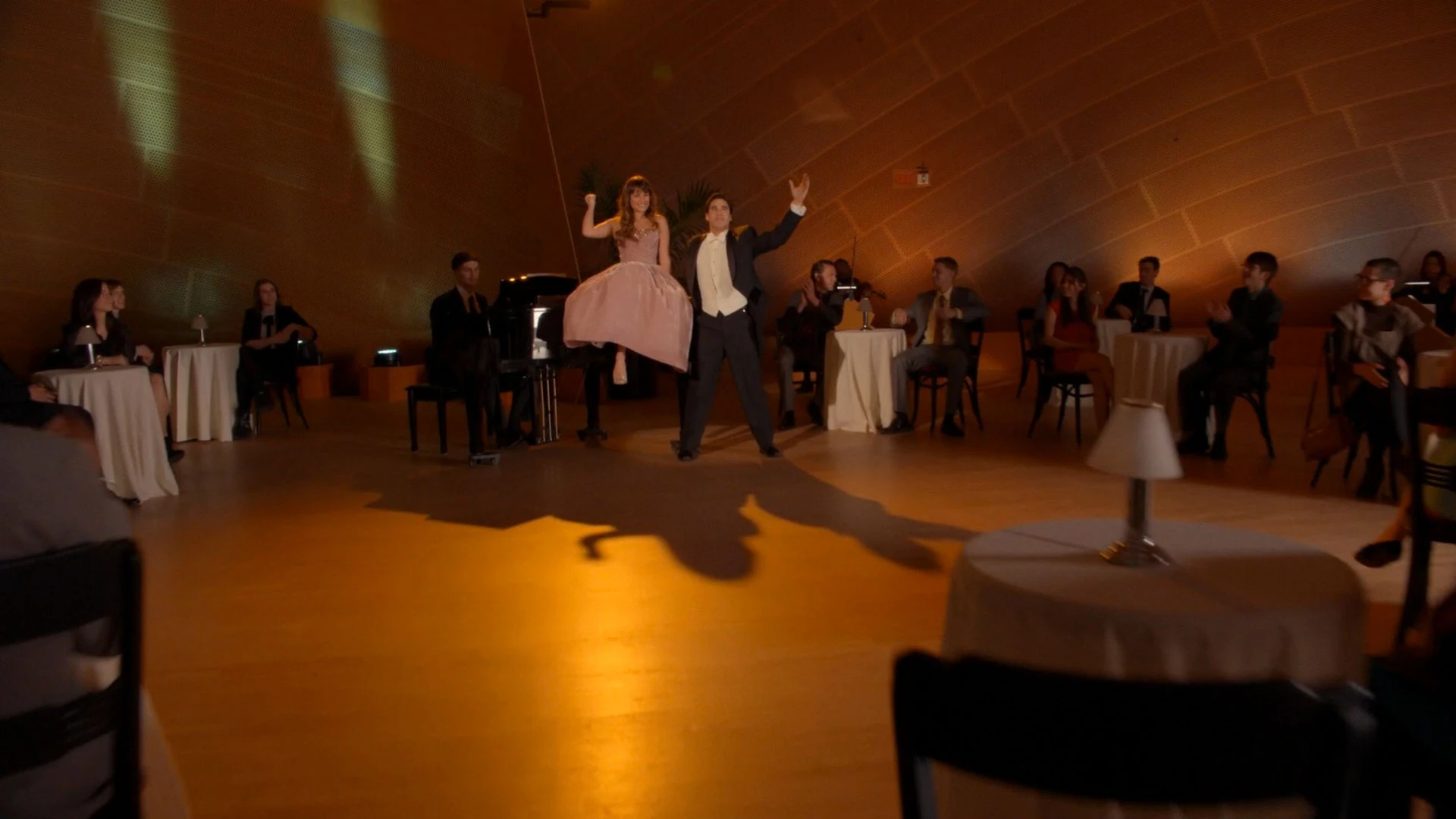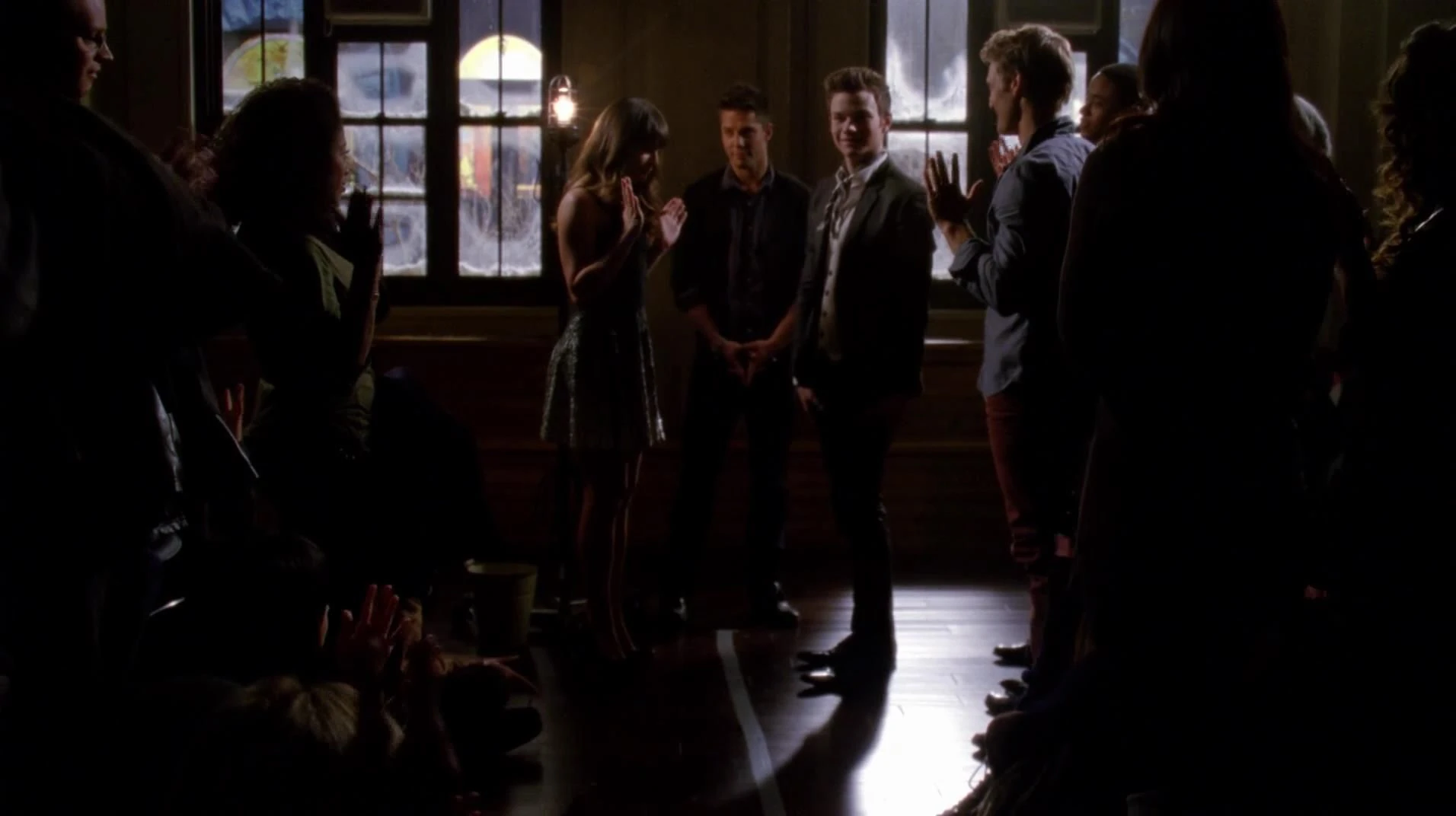 Aula, um sich auf die "NYADA"-Party vorzubereiten und performen Ding-Dong! The Witch Is Dead. Auf der Party werden sie begeistert von ihren Mitbewerbern, Harmony, Canada, Gavroche und Pendleton begrüßt, die ihnen eine Kostprobe ihres Könnens in Form des Mash-Ups Anything Goes/Anything You Can Do geben. Kurt und Rachel sind derart eingeschüchtert, dass sie daran zweifeln, eine Chance, an der NYADA angenommen zu werden, haben, zumal die Bewerber auch einige Ähnlichkeiten mit ihnen selbst aufweisen. Kurt beendet die Schmierenkomödie und versichert Rachel, dass sie auf die Schule gehen wird, was sie zurückgibt. Um dafür zu sorgen, außerhalb des Unterrichts "etwas" zu sein und so ihre Chanen zu erhöhen, schlägt Rachel vor, dieses Jahr "West Side Story" als Schulmusical aufzuführen, weil sie als Maria perfekt ihr Talent und Wesen demonstrieren kann, während Kurt verkündet, als Jahrgangssprecher zu kandidieren.
