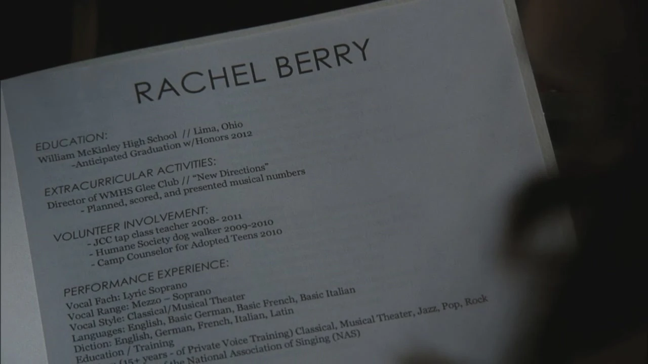 Rachel sucht Shelby auf, weil sie möchte, dass sie ihr, wegen ihrer Bekanntheit als Coach eines nationalen Showchor-Champions, ein Empfehlungsschreiben für die NYADA, welches sie schon vorgeschrieben hat, unterschreibt. Shelby macht es und sagt Rachel, dass sie stolz auf sie ist und sie nicht die erste Person ist, die neidisch darauf ist, was alles wundervolles auf sie zukommt. Rachel schlägt vor, dass Shelby ihre Empfehlungsschreibenversion schreibt, worauf sich Shelby ihren Lebenslauf ansieht und beeindruckt von den vielen Leistungen, wie das Schulmusical, die vielen Clubs und die Möglichkeit Jahrgangssprecherin zu werden, ist. Auf ihren Einwurf, dass ihr die Kids leidtun, die nichts davon vorzuweisen haben und "nicht den Hauch einer Chance" haben, auf die NYADA zu kommen, wird Rachel besorgt, da sie an Kurt denkt.