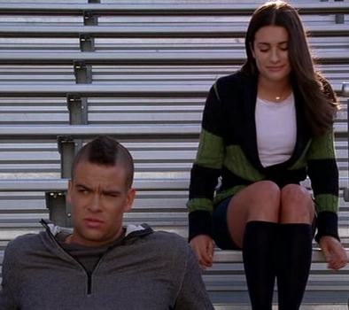 Puck beobachtet die anderen Footballspieler und Rachel setzt sich zu ihm. Sie fragt ihn, ob er wegen ihr sich für Glee und gegen den Football entschieden hat. Dann fällt ihr ein, dass immer wenn sie zu Finn starrt, Puck zu Quinn starrt und ob er wegen Quinn bei Glee geblieben ist. Puck erwidert, dass Finn und Quinn sich niemals trennen werden, vor allem nicht, wenn das Baby unterwegs ist. Rachel meint, dass sie und Puck ihre Beziehung beenden müssen, aber sie Freunde bleiben können. Puck meint, dass sie davor auch keine Freunde waren und lässt sie sitzen.