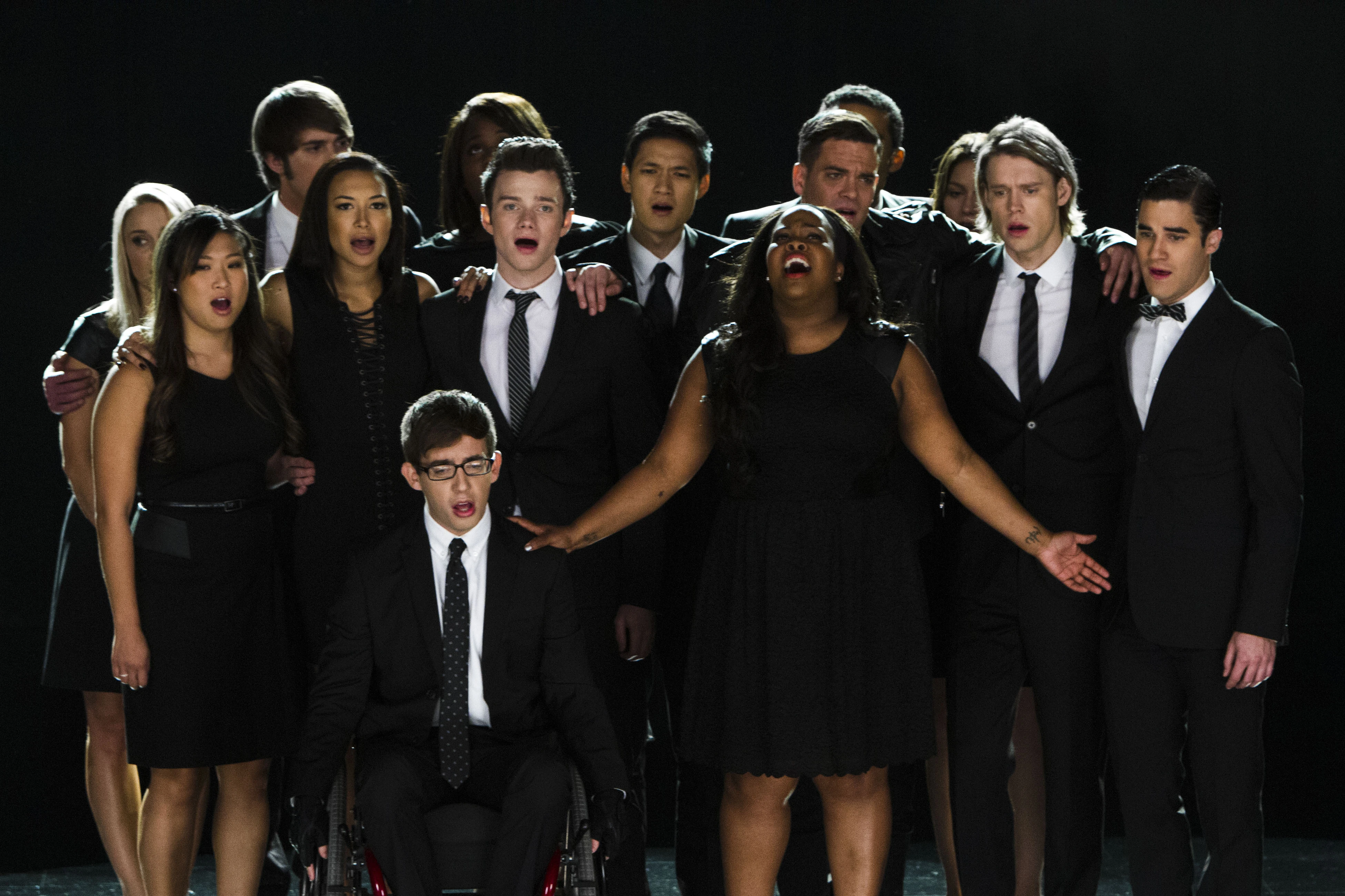 Kurt, Puck, Santana und Tina mit Absolventen und New Directions (Mercedes):