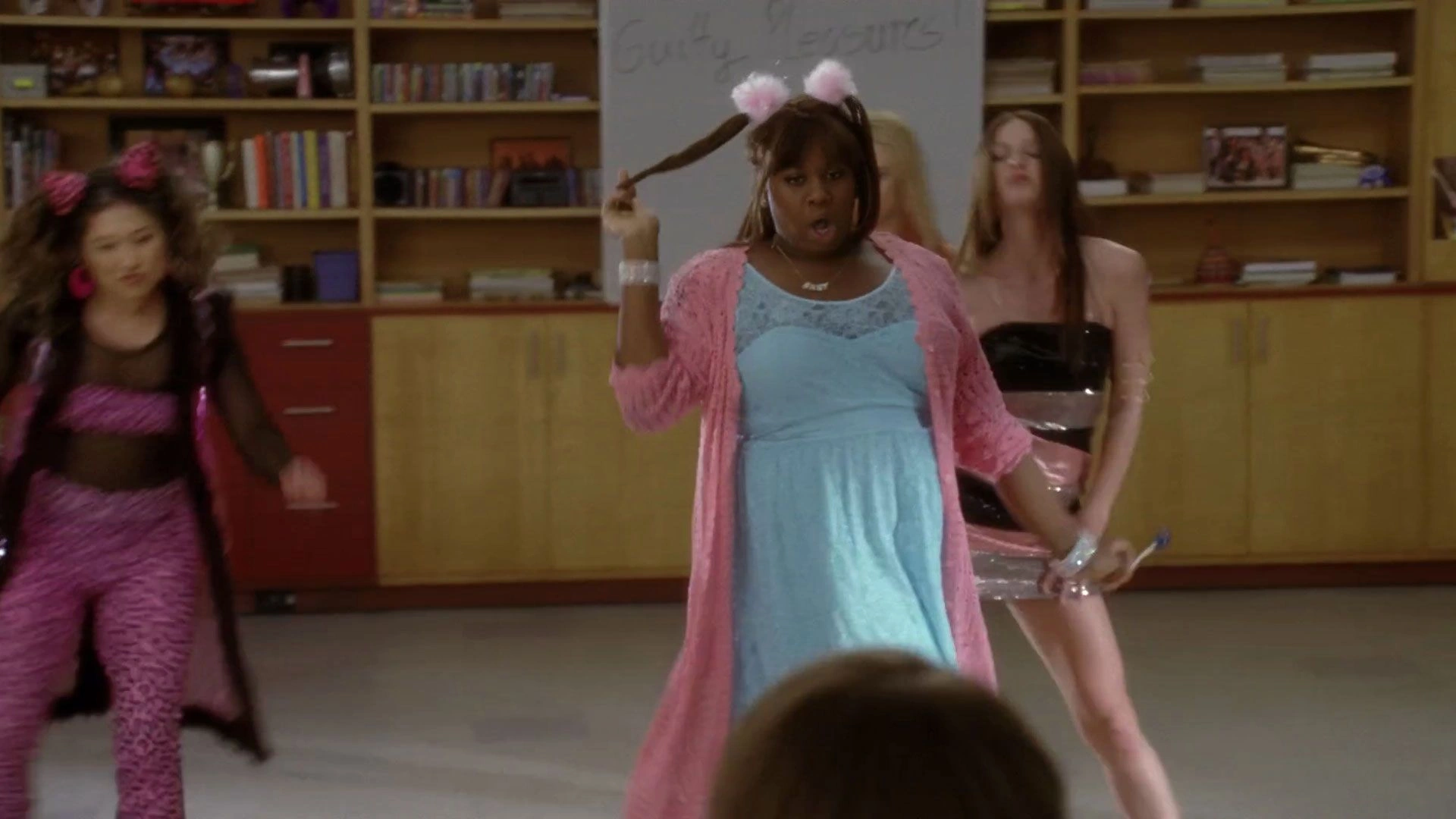 Jake in ein Tigerkostüm gesteckt und geschminkt. Sie einigen sich darauf, kein großes Trara um ihre Performance zu machen, sondern sich ausschließlich auf die Musik zu konzentrieren, so dass sie später in der Aula Wide Awake singen. Sie ist wieder im Chorraum, in einem Katy Perry-Outfit, wenn Tina herein stürmt und ihnen erzählt, dass ihre Gegner vorhaben, bei den Nationals Applause zu performen. Danach kommt Sue herein und suspendiert sie aufgrund ihrer Kostüme für eine Woche, wogegen sie sich mit Roar wehren.