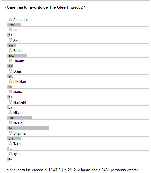 La última encuesta mensual comenzó el 5 de Junio de 2012 y terminó el 8 de Agosto de 2012. La pregunta fue ¿Quien es tu favorito de The Glee Project 2? A continuación está el resultado