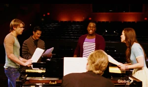 Rachel letteralmente fluttua in aria per afferrarlo e scoprire di aver avuto un callback per il musical, ovvero dovrà tornare in teatro ed esibirsi di nuovo per convincere finalmente i giudici. La puntata si conclude con le Nuove Direzioni che cantano una delle canzoni originali di Marley intitolata Outcast.