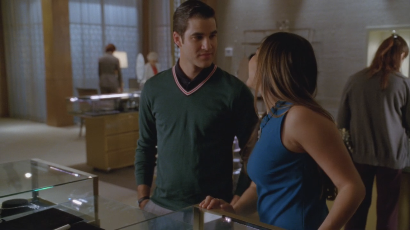 Tina helps Blaine shop for a wedding ring, and he's aided by Jan, a compassionate jewelry store employee who's proud that the LGBT community is on the brink of marriage equality. Sam shows up to support Blaine, and Jan offers to help Blaine navigate his plan so he can "see what's possible when two people really love each other."