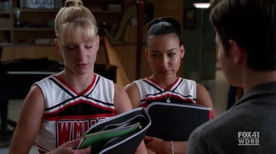 Sue splits the Glee Club into two groups. She puts the minorities on her side leaving Will with only five singers (including Brittany) and they perform No Air. While Finn and Quinn are arguing in Spanish class, Brittany tries to steal Quinn's paper to copy her answers, but she angrily grabs it back. When he only gives Rachel and Finn solos, Quinn tells Brittany and Puck that Will obviously doesn't like minorities and they defect to Sue's group, leaving Will with only three singers. She later performs background vocals in Keep Holding On.