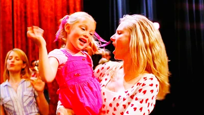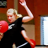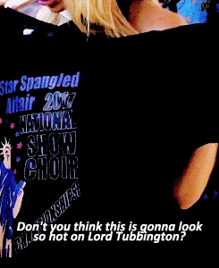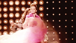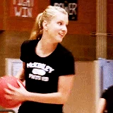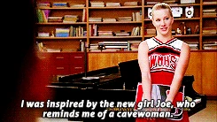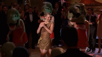 She and the Troubletones meet New Directions in the auditorium for Will and Shelby's performance of You and I/You and I, which she compares (in a favorable way) to having a stroke. Brittany defends Santana when Finn and Rory jeer at Santana, and then displays her acrobatic skills in a Troubletones vs. New Directions dodgeball match (Hit Me with Your Best Shot/One Way or Another).