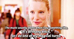 Brittany performs back up vocals with Tina during Mercedes' solo, Spotlight. Meanwhile, Brittany and Santana, alongside Kurt and Rachel, discuss how male leaders have ruined the world, but Brittany thinks girls can rule it, so Santana then says that she has