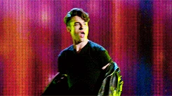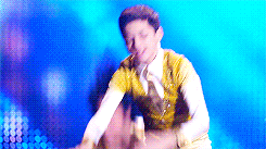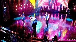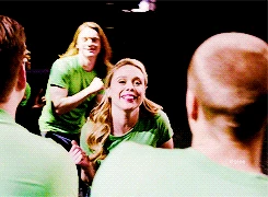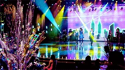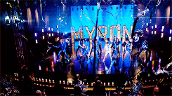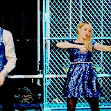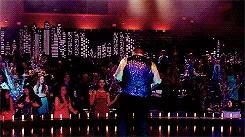 On stage, Sam instructs everyone to take their places while Will and Sue talk. Sue states that her plan is about to begin, and Will responds by saying it will start when he trips her up on stage in front of the 13-year-olds. Sue challenges him, saying he wouldn't dare, but Will insists that he would. Rachel then begins to sing Break Free (with the word "MYRON" in the background), and everyone else joins her on stage. Myron comes on stage with his stage pod, and the audience screams happily. As the song ends, ribbons fall all around the place, Spencer and Mason lifting Myron on their shoulders.