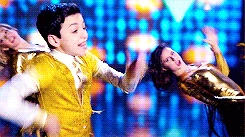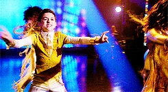 In the auditorium, Sue stands with a child next to her, with the glee club (and Rachel and Will) gathered. She introduces the child as the Superintendent's nephew, Myron. She continues, saying that he's going to celebrate his Bar Mitzvah (Rachel looking happy), explaining what it is. Myron states he's performing for them, and tells him it's just a rehearsal. He begins to perform Lose My Breath, wearing a suit of white and gold underneath, as female dancers in gold dance around him, in perfect sync. Everyone watching is either surprised at what he's doing, Sue looking horrifically surprised; Kitty, Spencer, and Roderick laughing slightly and dancing along, Will clapping his hands. At the end of the song, everyone applauds him, Rachel saying it was amazing. He thanks her, saying he's a fan of hers. He then states he needs it to be perfect, asking him how he can improve. Kitty suggests his dancers could smile a bit more, everyone else agreeing. He states that he's already told them that, firing them, sending them off stage, and asking to speak with the adults. Sue then whispers to Rachel, saying she should do anything he says. Myron states how he wants to perform in the auditorium (saying this to Rachel, Will, and Sue). Sue agrees. Myron states he wants the glee club to help and is willing to pay for them to perform. Will states that it's against the rules. Myron then states they'll get performing experience. He sees one of the dancers still there, sending her away rudely. Rachel begins to tell him that they can't, but Sue interrupts, saying that they accept.