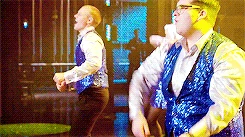 Roderick begins to climb up. He reaches up and makes the rope come loose. Everyone rushes to Myron, except for Spencer. Amazed, Roderick states that he can't believe he did that, but Spencer asserts that even in emergencies, babies can lift cars. Myron comes out, saying he thinks he's pooped his pants and that he can't go on like this. Sue asks Kitty to get butt wipes and get gummy bears. Rachel tells Myron they'll stall the audience and tells Jane and Spencer to get ready. Spencer then states he wants Roderick as well. On stage, Jane, Spencer, and Roderick perform Uptown Funk, everyone dancing along, Superintendent Harris, especially getting into the music. Some of the audience members go on stage and dance along with them until the other members of the New Directions come on stage. At the end of the performance, everyone claps for them.