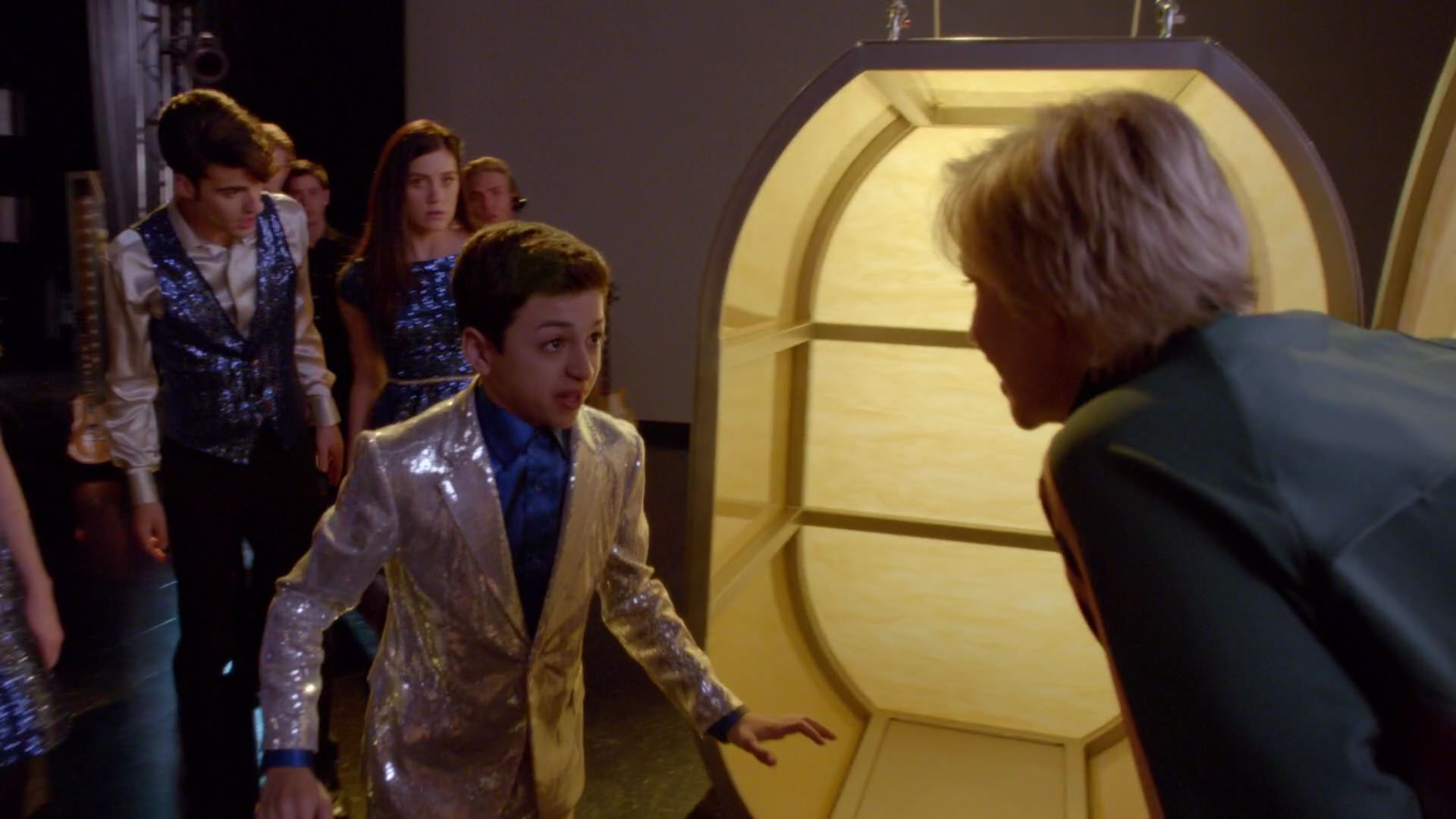 Roderick begins to climb up. He reaches up and makes the rope come loose. Everyone rushes to Myron, except for Spencer. Amazed, Roderick states that he can't believe he did that, but Spencer asserts that even in emergencies, babies can lift cars. Myron comes out, saying he thinks he's pooped his pants and that he can't go on like this. Sue asks Kitty to get butt wipes and get gummy bears. Rachel tells Myron they'll stall the audience and tells Jane and Spencer to get ready. Spencer then states he wants Roderick as well. On stage, Jane, Spencer, and Roderick perform Uptown Funk, everyone dancing along, Superintendent Harris, especially getting into the music. Some of the audience members go on stage and dance along with them until the other members of the New Directions come on stage. At the end of the performance, everyone claps for them.