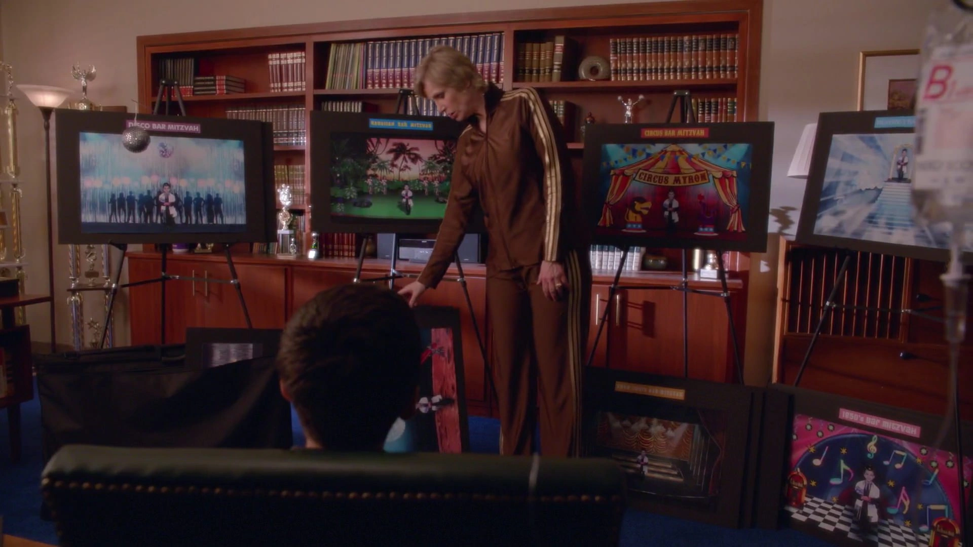The following day, in the staff room, Sheldon eats with a big appetite, as Rachel, Sam, and Will are engrossed by this. Sheldon states that the best thing about being a dude is not just eating chicken for lunch, but when he licks his lips, he can taste it all day. Everyone looks mildly disgusted. Sue stands near the coffee machine, pouring coffee onto the floor. Will asks if she's doing okay, to which she replies that she hasn't slept for 3 days. She tries to put her coffee cup down on the table, yet it falls and breaks. Sam asks what's going on, to which Sue replies that she's become a slave to Myron. In flashbacks, she tries to give ideas for his bar mitzvah. Myron states angrily that he wants it to be fresh, not unoriginal, and wants it to be about him, asking Janet (the jail secretary) to get him his espresso. Every night, Sue reads to him so he can read his bit for his bar mitzvah, so he doesn't have to memorize it himself. Will tells her it has to stop. She states it will once they all perform with her. Surprised, they ask if he wants them. Sue states that he blew his budget on getting new dancers. Sheldon states that he understands that they want everyone else, but he wonders why he's chosen. Sue states that since she's doing it, Sheldon also has to do it so she doesn't look like a fool. Sam states he's in.