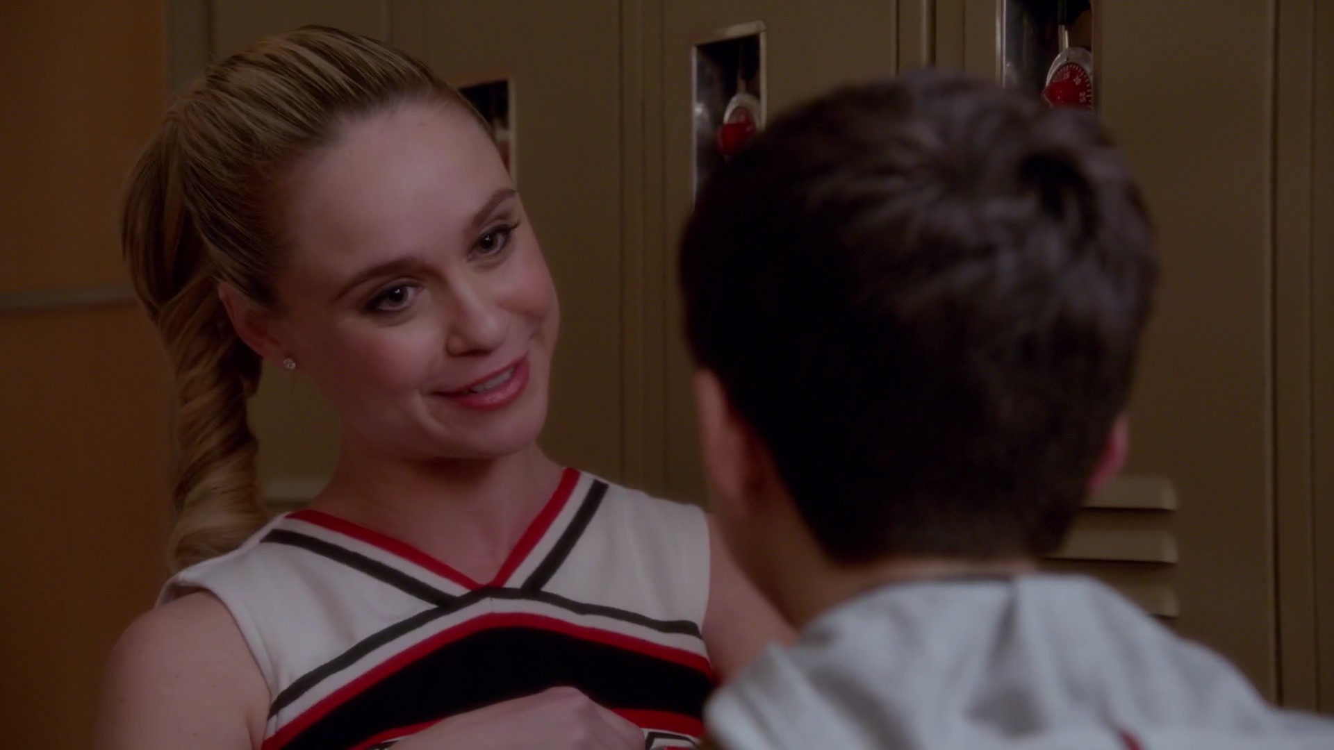 In the hallway, Kitty talks to Myron (who is standing on a stool). He places the stool in his locker and states that he'll never forget that she lent her underwear for the performance, handing her money. Kitty, not caring where the money came from, states she does deserve it. Myron states that if she sticks with him, she'll never go hungry, giving her more money and expecting a kiss. Kitty, saying no, states that he should keep the cash coming because she'll be his friend in glee club, as he needs one. They walk away as Myron continues to flirt with Kitty.