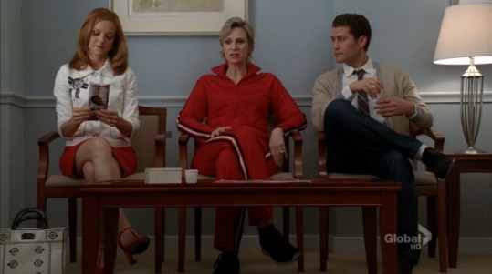 Emma is first seen in the auditorium sitting with Will, Santana and Kurt, just before the regionals competition begins. She is wearing a white dress which Santana sarcastically points out as her 'lucky' colour. She is seen dancing along to the New Directions performance of I Love It and cheering when it is announced that the New Directions are regionals champions.