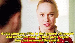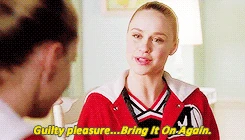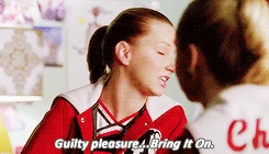 Brittany asks Kitty to say what her guilty pleasures are, and she'll do the same so people can get to know her. Kitty said that her guilty pleasures is that she like to fart around old people and just look at their faces cause they just assume they did it. And Brittany's guilty pleasures is when she look at a white dog or cat, she assumed that they're racist. Then she said that Lord Tubbington's guilty pleasure is scientology. Brittany continues their game by saying, "Guilty pleasures: Bring It On," to which Kitty responds with, "Bring It On Again," and the two list each movie they like. After they finish the list, Brittany asks Kitty to go again but Kitty won't tell her because it's too horrible. Meanwhile, Tina, who is watching the show on her laptop in the library, anxiously waits for Kitty to say her guilty pleasure. Brittany then asks, "Can you whisper it in my ears?" Kitty does this and it ends with Brittany saying, "Oh my God!"