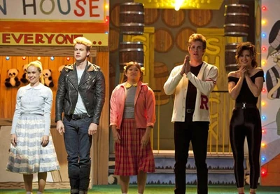 Marley's confidence takes another hit after Kitty reveals that a merciless theater critic is in the audience, and Ryder boosts her back up with a passionate kiss - one that doesn't escape Jake's notice. Their performance of You're the One That I Want prompts Rachel to fantasize she and Finn are singing the leads - in fact, all the glee club's fractured couples imagine dueting with their ex-loves.