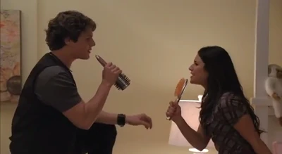 - This is the first episode in which a character (Rachel) sings a solo (Gives You Hell), a duet (Hello), and a lead in a group number (Hello, Goodbye).