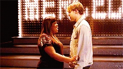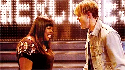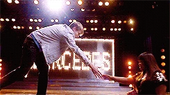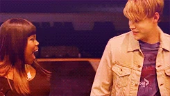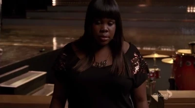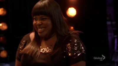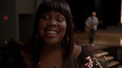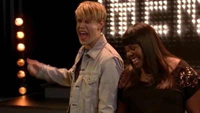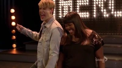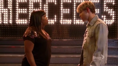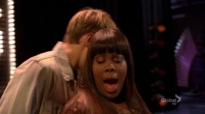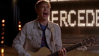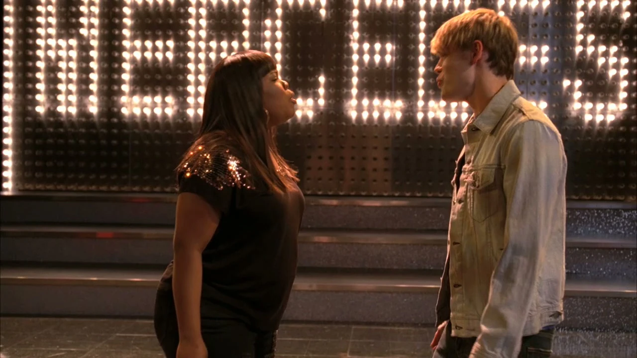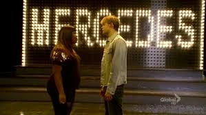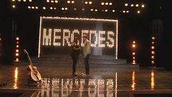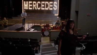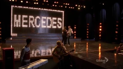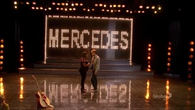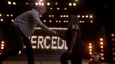 When Mercedes gets a text message from Sam to come to the auditorium to sing, he promises her that after the duet, he would let her go back to Shane and that he would stop pursuing her so desperately. She then starts to walk away, but as she is about to walk out of the auditorium, Sam starts playing the guitar and they end up singing to each other. During the performance, they sing playfully, and on the auditorium stage, there is a screen with big letters with Mercedes's name in flashing lights. After the performance, they share their first on-screen kiss.