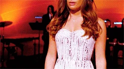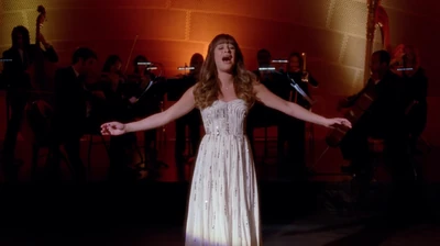 Back at NYADA, people in the audience open their mouths, amazed by Rachel's singing. Finn gives a final look at the choir room as he pushes out the trolley holding all the New Directions' belongings and flicks the light switch. Towards the end of the song, Carmen gives a look towards Kurt as he watches Rachel, upset about Carmen's news on his re-application. Once again, Rachel gets a standing ovation and then hugs Kurt as Carmen comments on her performance.