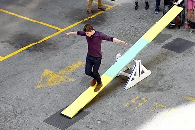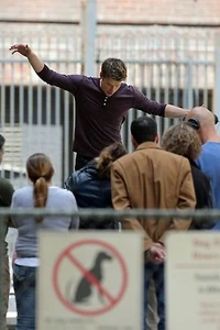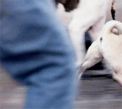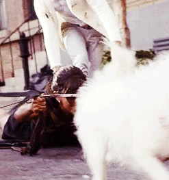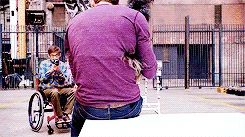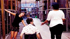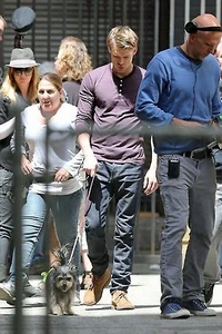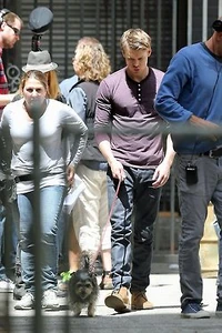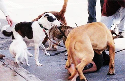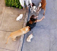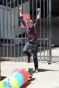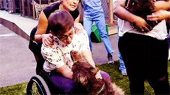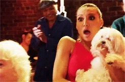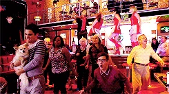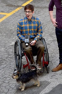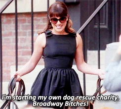 In the streets of New York, Rachel uncertainly leads a dozen dogs on leads through the street. Blaine and Artie have positioned themselves among some lunching paparazzi, and loudly announce her arrival. Rushing over to her, they begin to take pictures, and Rachel announces her charity 'Broadway Bitches' to a mock-delighted Santana. However, the dogs spot a man eating a sandwich, and eagerly pursue the food. Rachel is dragged behind them, with the paparazzi following. Watching a dog trying to mate with a photographer's leg, Santana covers her mouth at the abject failure of the publicity stunt.