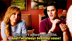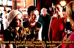 At the end of the song, Rachel gives an interview. She credits Santana and Kurt for the idea behind and success of the project, but Kurt is quick to point that it was a true collaboration, and that they're just happy to be giving back. The three friends share a group hug, happily.