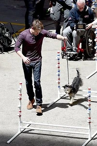At a dog agility course, Sam explains his plan to Artie. He means to train McConaughey before Mercedes gets home in the evening, whereupon he can melt her heart with his puppy-dog eyes. Artie is unconvinced, but they both set about attempting to house-train the dog, while singing Werewolves of London.