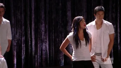 Rachel with Finn and New Directions (Mercedes):