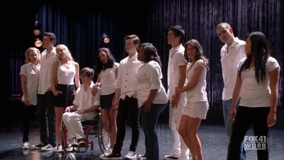 Rachel with Finn and New Directions: