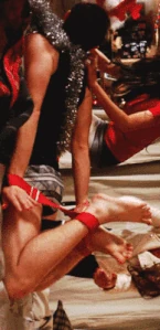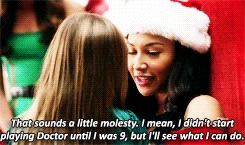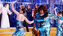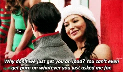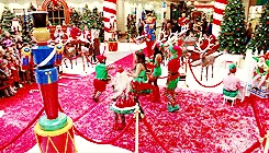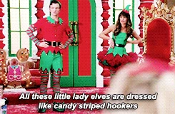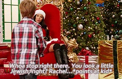At the apartment, Cody gets them high on helium and drunk on alcohol and they sing The Chipmunk Song. Afterwards, the high inspires Rachel to invite Santana to move to New York, and Kurt begins making out with the manipulative Santa Claus. The next morning however, Rachel and Santana appear sick and dazed where they fell asleep fully dressed and Santana suggests they'd been roofied. After the girls get up, they find a half-naked Kurt bound and gagged on his bed, and the apartment empty. The rough trade Santa was actually there to rob them. Kurt feels ashamed by what happened, especially when they learn that Cody also robbed Santa Land - and got them all fired. But Rachel has gotten them new jobs. They close out the episode also singing Away in a Manger, this time from their new jobs as singing mannequin-type people in a Manhattan store window display.