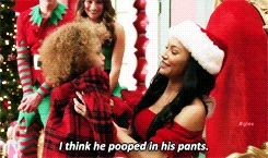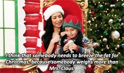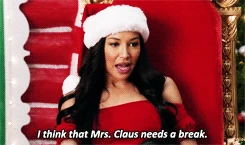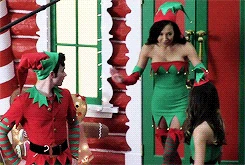 In New York, Santana is in town just stopping by to see Kurt and Rachel as she tries to get over breaking up with Brittany. The three take jobs as elves at a mall's Santa Land display, but unfortunately for them, they have the worst Santa ever - he shows up very late for work and has a drinking problem. Being the ever-resourceful performers they are, they begin singing Here Comes Santa Claus. Unfortunately, the angry mob of children don't approve and start throwing things at them. Attempt number two sees Santana dressed as a sexy Mrs. Claus, and while the kids initially respond well to her, she is perhaps the worst Mrs. Claus ever, and insults the kids instead of helping them. Enter Cody, also known as "Sexy Claus," who agrees to help them out with their troubles if he can come over for dinner first. So they invite him to the Bushwick apartment for a tree-trimming party.