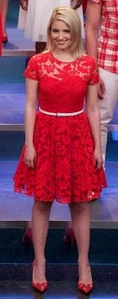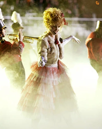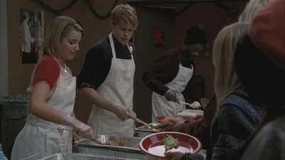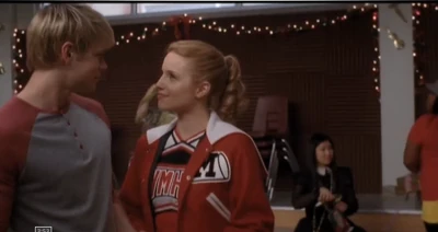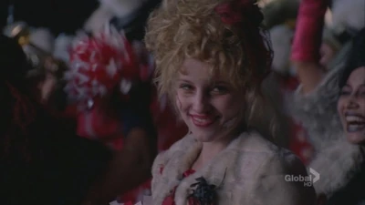 Quinn is first seen performing back-up vocals during All I Want for Christmas Is You with Mercedes and the rest of New Directions as they decorate the Christmas tree in the choir room. Later, she is seen duringRory's performance of Blue Christmas and is later seated next to Kurt, while Rachel and Blaine sing their original song Extraordinary Merry Christmas. Later, however, we see that instead of being there for the filming of Glee Club's Christmas special, she is serving food with Sam at the homeless shelter. He says she's gotten better since the previous weeks, and she agrees that she has gotten better and has stopped focusing on the things she doesn't have. Sam says he's glad Quinn turned her act around because she deserves good things, and she says she's trying her hardest to do so. Sue joins their conversation, telling them to be cautious about portion size since there isn't enough food. Later, when New Directions comes in the homeless shelter, she sings along with them to Do They Know It's Christmas?.