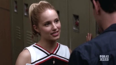 Quinn makes her first appearance and is revealed to be Finn's girlfriend. She is also seen as having Protestant Christian or Catholic Christian faith (this is shown by the cross necklace she wears and the portrait of Jesus Christ in her room). She is the president of the celibacy club. She is portrayed as a cruel and mean girl because she is seen laughing at Rachel's Myspace, which contains videos of Rachel singing. She also asks Finn what he's doing talking to her in a mean manner.
