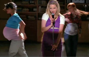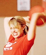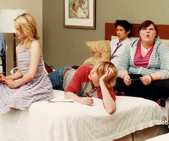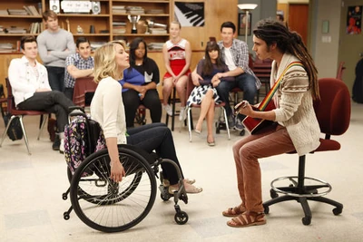 Finn finds Quinn watching Cheerios practice from the stands. The two of them talk about the financial difficulties with the pregnancy, and Quinn rips Finn for not being man enough to find a job and help her raise their baby and tells him to get money because she needs maternity clothes before her baby bump explodes and she becomes "enormous." Puck gives Quinn some cash ($18) for their kid. She gives it back, saying she will go to her grave swearing it is Finn's baby, even if it comes out with a Mohawk. Puck suggests that it would be "pretty awesome" if the baby did, and this leads to them having a playful food fight. As it appears they are about to kiss, Finn walks in, leaving him somewhat suspicious. Puck goes out of his way to make cupcakes for the bake sale for Artie to earn money for Quinn, stating, "his baby mama was going to have it all." Puck tries again to give Quinn some cash from the cupcake fund. He explains that he's not really a screw-up and could offer Quinn a home and that they could be a family. She tells him she won't take the money from a friend in a wheelchair but apologizes for calling him a "Lima Loser" earlier and goes on to tell him that he's "special and romantic." Finn comes up and tells Quinn he's finally gotten a job. She leaves with Finn as they wheel away; she looks back at Puck regretfully, and he stares after her longingly. As Puck hands over the money from the bake sale. She watches on with pride and approval. She performs background vocals inProud Mary in wheelchairs.