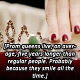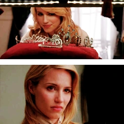 Quinn is shown getting ready to be prom queen. She wears a beautiful blue dress to prom and Finn says to her, "You are the most beautiful girl I have ever seen in my life." She is furious when Finn is kicked out of prom for fighting with Jesse. She loses prom queen to Kurt, because students voted to offend him. Furious nonetheless, she runs into the bathroom and slaps Rachel across the face, accusing Rachel of ruining her night, though she later makes up with her (Rachel). The two then have a heart-to-heart in which Quinn reveals that she's terrified all the time of what will happen after high school.