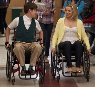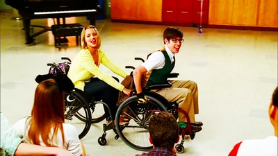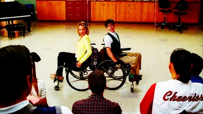 Quinn approaches Finn and Rachel saying that though she is in a wheel chair, she is just happy to be alive and proceeds to race with Artie to the Choir room singing I'm Still Standing with Artie. She then tells the rest of the Glee Club not to feel sorry for her because she is okay and is positive that she will be able to walk again, making a promise to be able to sing and dance with the rest of them at Nationals. Later, while everyone is planning what to do for senior skip day, Rachel starts crying about Quinn being in a wheel chair, partially blaming herself but Quinn reassures Rachel that it wasn't her fault and hugs her. She also then suggests that for senior skip day, the New Directions should go to Six Flags. Later, Quinn and Artie are seen with Artie encouraging Quinn to make it up a steep ramp on the school campus, cheering her on all the way and she accomplishes the task. Artie then comes up with an idea on how they should spend senior skip day together at a skate park where others like them like to go. Quinn catches Finn while he is texting and walking in the hallway and lectures him on how it's not a good idea. She also tells him that she and Artie have plans for senior skip day so she is not able to make it to Six Flags. At the skate park with Artie, Quinn is amazed at all the people there that are not letting their handicapped situations get in their way. She and Artie sing at the park. Near the end, Artie brings up that Quinn should maybe get used to being in a wheelchair to which Quinn says is temporary and that she will be able to walk again. Artie asks her what if she isn't able to walk anymore but Quinn is adamant on being able to walk again. At school, while Quinn is trying to get something out of her locker, some of her books fall out and Joe Hart helps her with them. He then walks with her to class and Quinn is grateful for his company. Joe than tells Quinn that he is praying for her, something she is thankful for until she finds out that he isn't praying for what she thought he was praying for and gets upset. She apologizes and invites Joe to New Direction's Booty Camp in the auditorium where he then joins the New Directions.