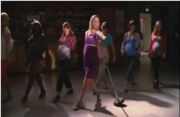 Quinn is seen performing the first verse of Don't Stop Believin' with Finn during Glee Club as she had taken over for Rachel, who was originally going to be performing the song. In the middle of the performance, Quinn gets bad morning sickness and runs out of the choir room. Finn lies to Mr. Schue and the others that she is sick due to a bad burrito even though Mr. Schue already knows. Everyone is suspicious of this and does not believe him. It is in this episode Puck reveals she's pregnant, lying that it's Finn's, causing the Glee Club to tell Rachel, who leaves New Directions again. When Rachel returns to the Glee Club and tells the others that she can go on for April Rhodes, who had been told by Will she had to quit before the Somebody to Love performance, Quinn tells her that she can't go on because she doesn't know the choreography to the song. She is then seen singing Somebody to Love with the Glee Club.