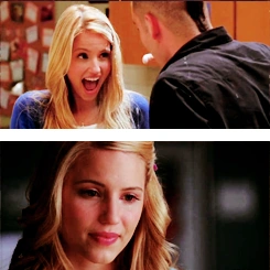 Quinn sits with the other glee members in the choir room when Finn says he should sing a duet with Rachel at nationals stating, "We killed it withFaithfully." Quinn retorts, "Yeah, killed us. We lost." She attended Jean's funeral, where she, along with others in New Directions, sings Pure Imagination. Right after the funeral, Finn breaks up with Quinn, saying it was because he no longer had feelings for her, stating he doesn't feel 'tethered' to her like the way Sue talked about Jean, yet really he still has feelings for Rachel. When Finn asks if she 'feels' anything anymore, a tear rolls down her face and she asks if it (the tear/making her cry) is enough 'feeling' for him. Quinn then gets out of the car after he tries to apologize and runs away crying, leaving Finn alone. He later tells her in Glee that he's proud of how she was reacting to the breakup, and how she didn't quit Glee. She replies telling him that her quitting Glee would ruin her plans for New York. When Finn asks about what type of plans she has, she answers with a simple, "You'll see."