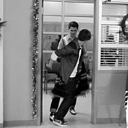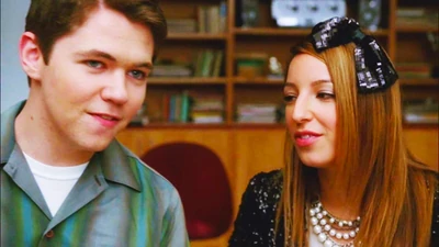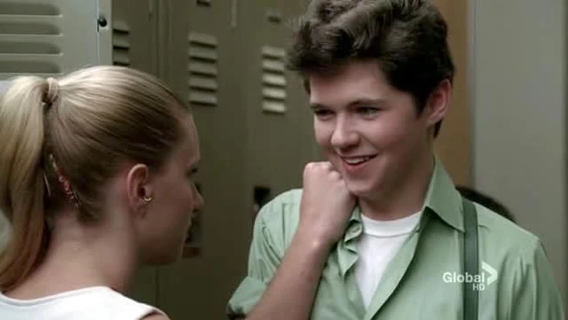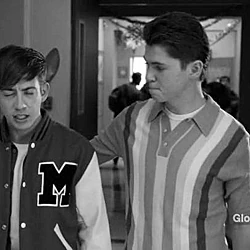 In the choir room, Rory is spun around in a chair by Joe. He walks out of class with Joe and turns him around when h