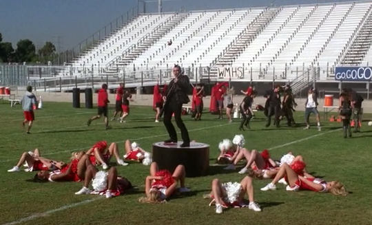This song was sung by Puck after he decided to screw school. The performance starts from the hallway, to the choir room where New Directions is watching in a complete shock, some, being scared of the people in which Puck brought with him; back to the hallway as he rides a motorbike down the hallway and on the Football Field where he dances with the Cheerios and the football team. At the end of the performance, Puck lights the guitar and is seen back in the choir room with New Directions looking on with confused faces as he exits the choir room.