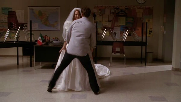 Emma decides to wear a wedding dress belonging to her cousin - her cousin didn't wear her dress to the dance rehearsals and her husband kept stepping on the train (apparently they had a fight and were divorced three months later). At the end of the number, Will and Emma fall onto each other and it looks as if they are about to kiss. Ken, shocked, sees them through the window.